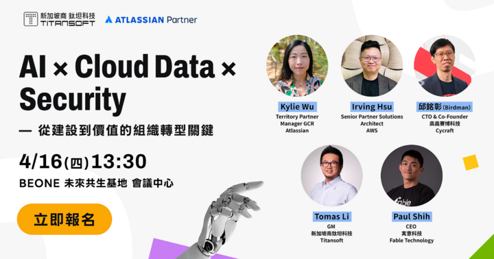Atlassian × AWS × Fable x CyCraft 實務觀點 知識管理 x 資料上雲 x 資安治理 一手掌握 Titansoft GM 與四大夥伴討論 AI 投資 ROI 衡量框架
